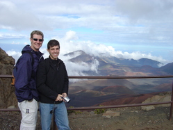 We work together at a weather forecast web site called "The Weather Underground". It is a small company where John is a meteorologist and Brendan is a web site developer. While working at the same company presents a unique dynamic in our relationship, it has only made us stronger. The benefits of working together are wonderful, and we get to spend all our time together. Each day's commute is a chance to talk and unwind from the day, and we can support each other in the middle of a hard day. If we drive the car to work, we sing 80's songs on the radio and laugh about hair bands. The best part of working together is when we get excited about the same project and can combine our skills to create something new and useful on the Internet.